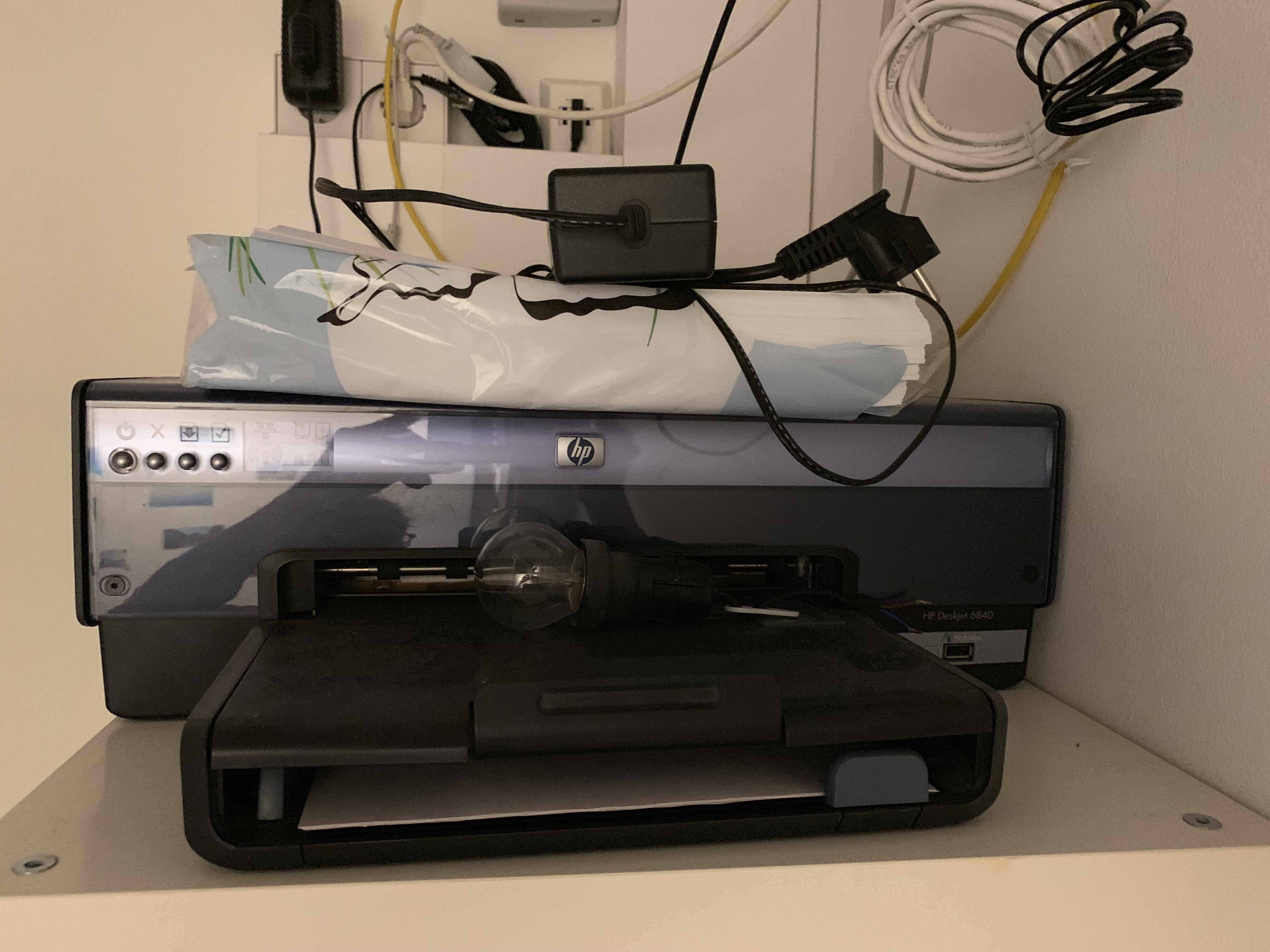 Einen HP Deskjet 6840 WLAN-Drucker. Die Tintenpatronen müssen vermutlich ausgetauscht werden. Hab das Ding lange nicht benutzt. Das kann aber Duplexdruck (beidseitig drucken) und hat WLAN/WiFi drin. Ist ganz cool eigentlich, steht bei mir aber nur rum – und ist auch nicht mehr der neuste. Gegen ne Spende in einen der Töpfe abzugeben. Das Papier, das auf dem Foto oben auf dem Drucker liegt, gibt’s dazu.